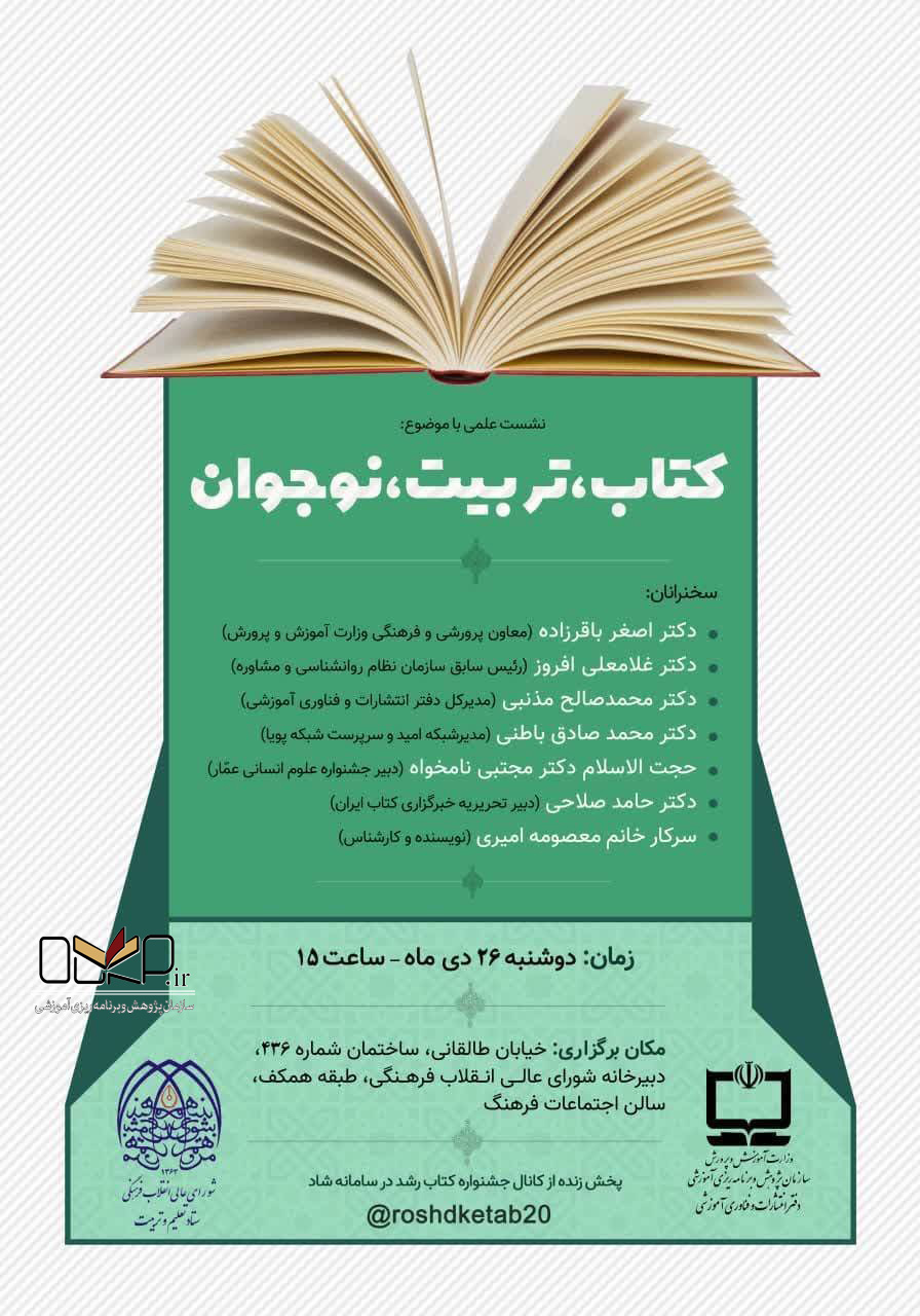 به گزارش روابط عمومی و امور بین‌الملل سازمان پژوهش و برنامه‌ریزی آموزشی، نشست تخصصی «کتاب، تربیت،  نوجوان» از سلسله نشست‌های علمی بیستمین جشنواره ملی کناب رشد روز دوشنبه 26 دی‌ماه ساعت 15 با حضور دکتر اصغر باقرزاده (معاون پرورشی و فرهنگی وزارت آموزش و پرورش)، دکتر غلامعلی افروز (رئیس سابق سازمان نظام روانشناسی و مشاوره)، دکتر محمدصالح مذنبی (مدیرکل دفتر انتشارات و فناوری آموزش سازمان پژوهش و برنامه‌ریزی آموزشی) دکتر محمدصادق باطنی (مدیر شبکه امید و سرپرست شبکه پویا)، حجت‌الاسلام دکتر مجتبی نامخواه (دبیر جشنواره علوم انسانی عمار)، دکتر حامد صلاحی (دبیر تحریریه خبرگزاری کتاب ایران) و سرکار خانم معصومه امیری (نویسنده و کارشناس)  برگزار می‌شود.