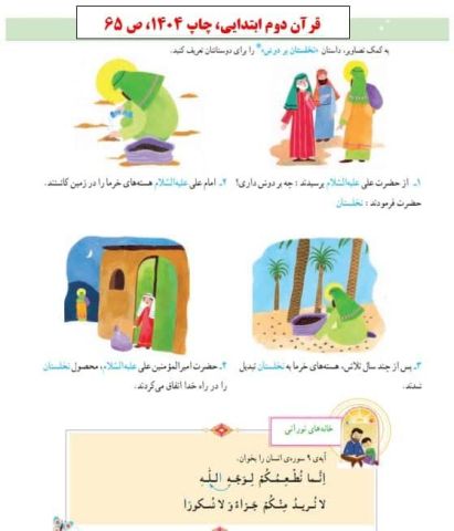 - داستان پیامبر اکرم(صلیاللهعلیهوآله) و حضرت علی(علیهالسلام) (کتاب قرآن پایه سوم، ص ۱۰۸)؛