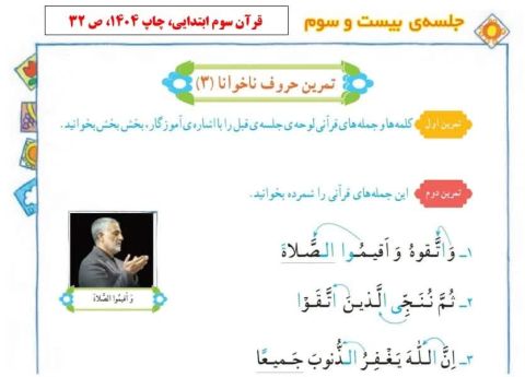 - تصویر نماز سردار دلها شهید حاج قاسم سلیمانی (کتاب قرآن پایه سوم، ص ۳۲)؛