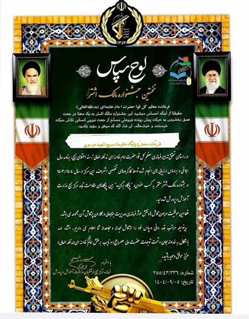 به گزارش روابط‌عمومی و امور بين‌الملل سازمان پژوهش و برنامه‌ریزی آموزشی، بر اساس ارزیابی‌های انجام‌شده توسط مرکز بسیج فرهنگیان وزارت آموزش و پرورش، پایگاه مقاومت بسیج شهید موسوی این سازمان در جشنواره مالک اشتر موفق به کسب عنوان «پایگاه برگزیده بین پایگاه‌های مقاومت تابعه وزارت آموزش و پرورش» شد.