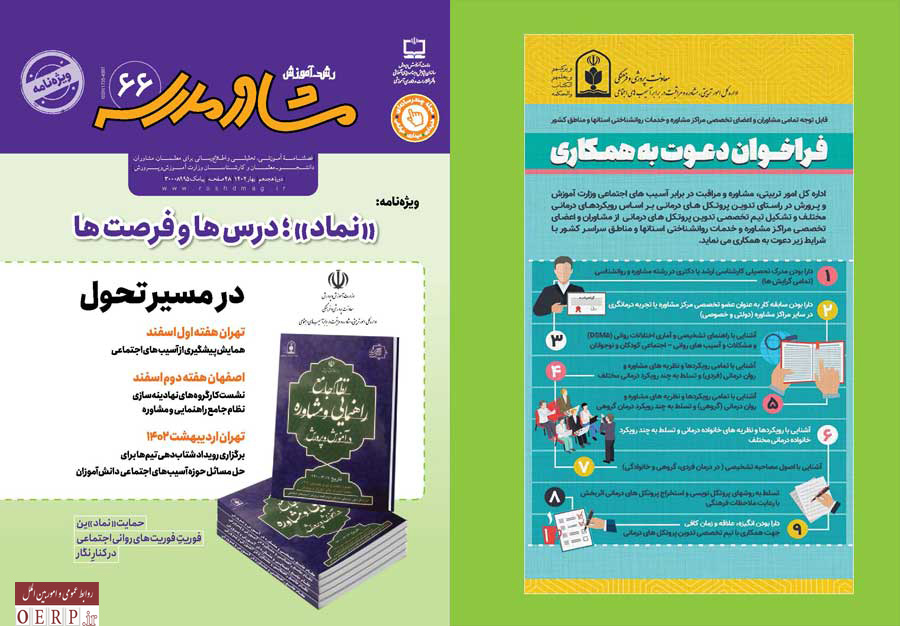 رشد آموزش مشاور مدرسه در این ویژهنامه تلاش شده است تا با بهرهگیری از مشاوران و مربیان، طرحهای حمایتی، فوریتی و برنامههای نماد در عرصه سلامت روان دانشآموزان واکاوی کند تا مشاوران و معلمان با مطالعه هدفمند این ویژهنامه، در زمینه اعتلای کمالات اخلاقی و تربیتی مراجعان خویش به شایستگیهای ویژهتری مجهز شوند.
