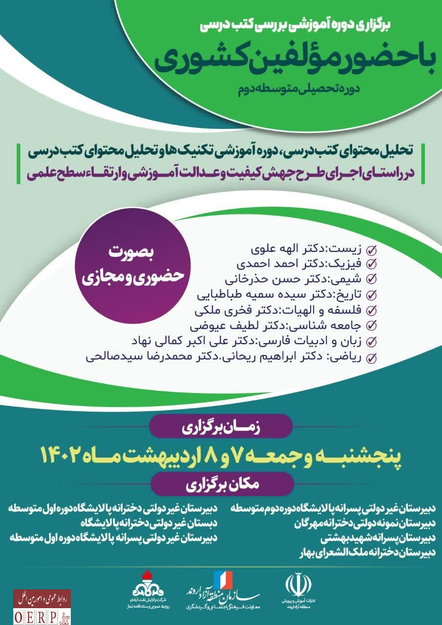 این دوره با حضور مولفأن کتابهای درسی حوزههای تربیت و یادگیری ریاضی، حکمت و معارف مطالعات اجتماعی و علوم انسانی، علوم تجربی و زبان و ادبیات فارسی، 7 و 8 ارديبهشت ماه در شهرستان آبادان برگزار شد. مؤلفين ضمن تبيين اهداف و رويكرد برنامههای درسی، در خصوص چگونگی ارتقاء شاخصهای آموزشی، توانمندسازی معلمان، چگونگی ایجاد انگیزه در دانشآموزان و کیفیت بخشی آموزش، راهکارهای عملياتی ارائه كردند. در ادامه برگزاري اين دوره دو روزه دبیران مربوطه با مشاركت فعال خود به بررسی و تحليل محتوای كتابهای درسی رياضی، حسابان، رياضيات گسسته، هندسه، فارسی، علوم و فنون ادبی، نگارش، فلسفه و منطق، جامعه شناسی، هويت اجتماعی، تاريخ، زيست شناسی، شيمی، فيزيك پرداختند.