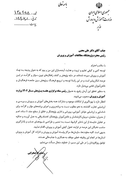 توسعه كمي و کیفی تعلیم و تربیت و هدایت آینده سازان این مرز و بوم که به عنوان ودیعه به نهاد آموزش و پرورش سپرده شدهاند، در سایه پژوهش و کشف راهکارهای نوین، موثر و کارآمد در این عرصه امکانپذیر است و در این راستا توسعه و ترویج فرهنگ پژوهش بین جامعه فرهنگیان و دانش آموزان نقشی بیبدیل دارد. به منظور تحقق این آرمان رفیع به عنوان رئیس ستاد برگزاری هفته پژوهش سال ۱۴۰۲ وزارت آموزش و پرورش منصوب میشوید.