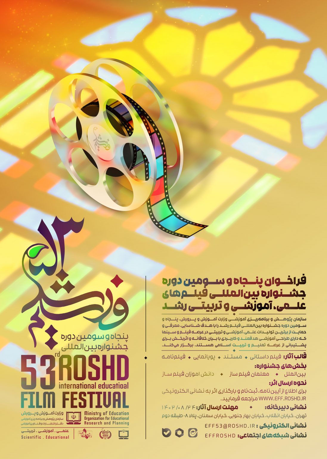 گفتنی است، پنجاه و سومین دوره جشنواره بینالمللی فیلمهای علمی، آموزشی و تربیتی رشد در مجتمع فرهنگی هنری سینما فلسطین برگزار خواهد شد و پس از آن آثار برگزیده در سراسر کشور برای مدارس به اکران در خواهد آمد.
