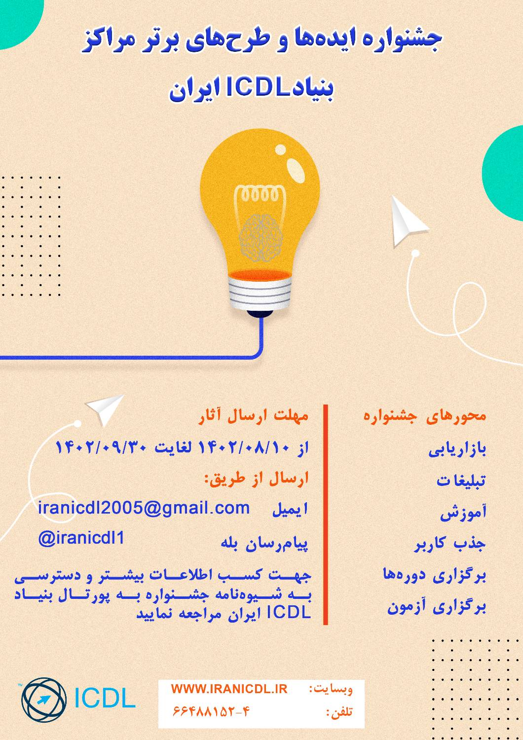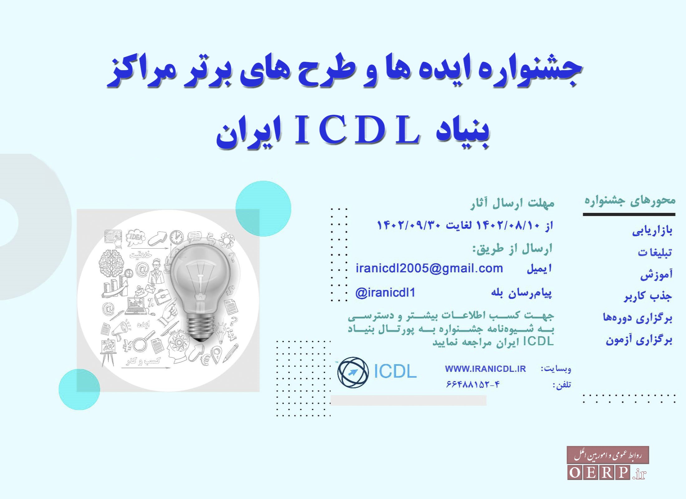 به گزارش اداره روابط عمومي و امور بين الملل سازمان پژوهش و برنامهريزي آموزشي، بنیاد ICDL ایران در نظر دارد با هدف معرفی طرحها، ایدهها و تجربیات مراکز فعال و پویا جشنواره ایدهها و طرحهای برتر مراکز بنیاد را در سراسر کشور برگزار نماید.