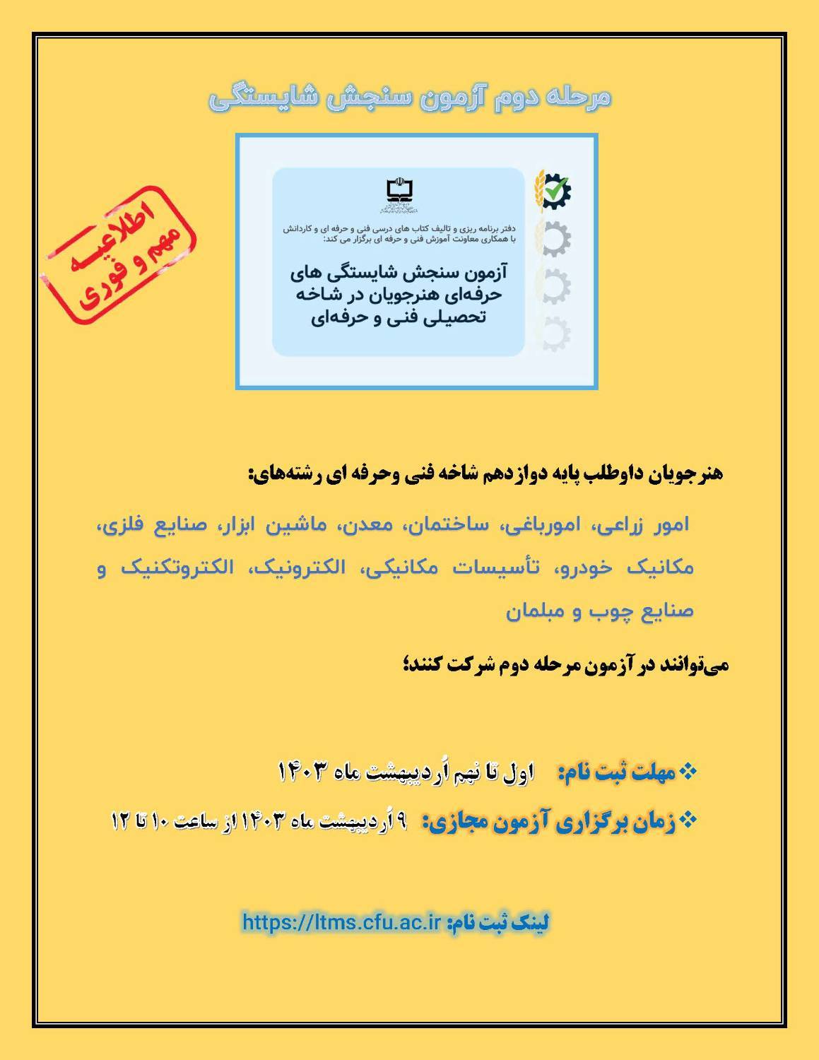 به گزارش اداره روابط عمومي و امور بين الملل سازمان پژوهش و برنامه ريزي آموزشي هنرجویان داوطلب پایه دوازدهم شاخه فنی وحرفه ای رشته های امور زراعی، امورباغی، ساختمان، معدن، ماشین ابزار، صنایع فلزی، مکانیک خودرو، تأسیسات مکانیکی، الکترونیک، الکتروتکنیک و صنایع چوب و مبلمان میتوانند درآزمون مرحله دوم سنجش شایستگی های حرفه ای هنرجویان در شاخه تحصیلی فنی و حرفه ای شرکت نمایند.