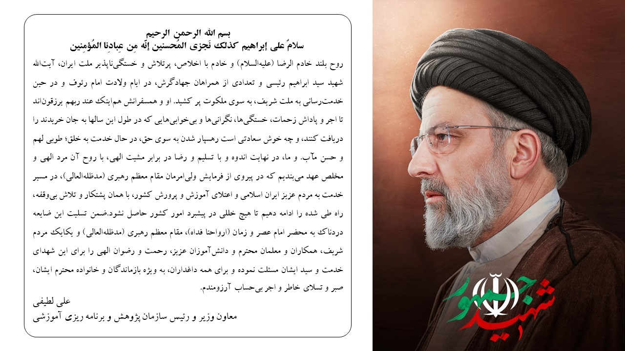 روح بلند خادم الرضا (علیهالسلام) و خادم با اخلاص، پرتلاش و خستگیناپذیر ملت ایران، آیتالله شهید سید ابراهیم رئیسی و تعدادی از همراهان جهادگرش، در ایام ولادت امام رئوف و در حین خدمترسانی به ملت شریف، به سوی ملکوت پر کشید. او و همسفرانش هماینک عند ربهم یرزقوناند تا اجر و پاداش زحمات، خستگیها، نگرانیها و بیخوابیهایی که در طول این سالها به جان خریدند را دریافت کنند، و چه خوش سعادتی است رهسپار شدن به سوی حق، در حال خدمت به خلق؛ طوبی لهم و حسن مآب. و ما، در نهایت اندوه و با تسلیم و رضا در برابر مشیت الهی، با روح آن مرد الهی و مخلص عهد میبندیم که در پیروی از فرمایش ولیامرمان مقام معظم رهبری (مدظلهالعالی)، در مسیر خدمت به مردم عزیز ایران اسلامی و اعتلای آموزش و پرورش کشور، با همان پشتکار و تلاش بیوقفه، راه طی شده را ادامه دهیم تا هیچ خللی در پیشبرد امور کشور حاصل نشود.ضمن تسلیت این ضایعه دردناک به محضر امام عصر و زمان (ارواحنا فداه)، مقام معظم رهبری (مدظلهالعالی) و یکایک مردم شریف، همکاران و معلمان محترم و دانشآموزان عزیز، رحمت و رضوان الهی را برای این شهدای خدمت و سید ایشان مسئلت نموده و برای همه داغداران، به ویژه بازماندگان و خانواده محترم ایشان، صبر و تسلای خاطر و اجر بیحساب آرزومندم.