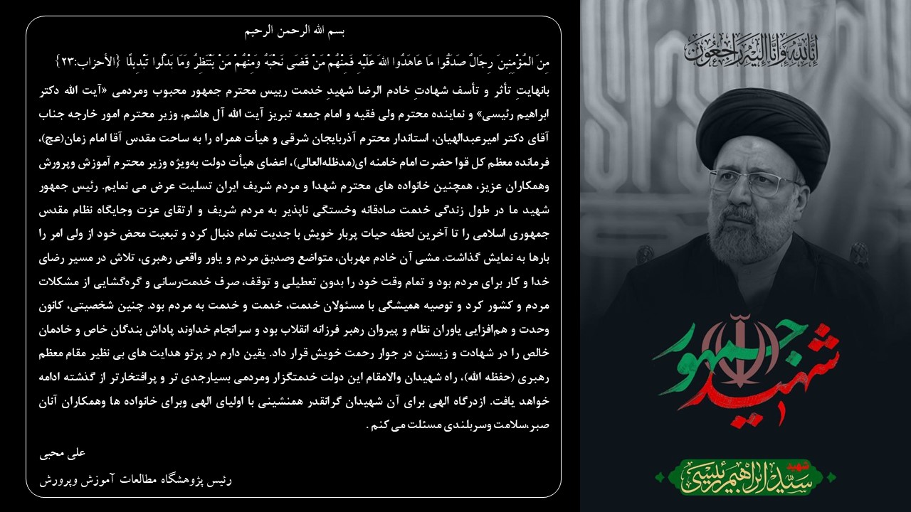 بانهايتِ تأثر و تأسف شهادتِ خادم الرضا شهيدِ خدمت رييس محترم جمهور محبوب ومردمی " آيت الله دكتر ابراهيم رئيسی" و نماينده محترم ولی فقيه و امام جمعه تبريز آيت الله آل هاشم، وزير محترم امور خارجه جناب آقای دكتر اميرعبدالهيان، استاندار محترم آذربايجان شرقی و هيأت همراه را به ساحت مقدس آقا امام زمان(عج)، فرمانده معظم كل قوا حضرت امام خامنه ای(مدظلهالعالی)، اعضای هيأت دولت بهويژه وزير محترم آموزش وپرورش وهمكاران عزيز، همچنين خانواده های محترم شهدا و مردم شريف ايران تسليت عرض می نمايم. رئيس جمهور شهيد ما در طول زندگی خدمت صادقانه وخستگی ناپذير به مردم شريف و ارتقای عزت وجايگاه نظام مقدس جمهوری اسلامی را تا آخرين لحظه حيات پربار خويش با جديت تمام دنبال كرد و تبعيت محض خود از ولی امر را بارها به نمايش گذاشت. مشی آن خادم مهربان، متواضع وصديق مردم و ياور واقعي رهبری، تلاش در مسير رضای خدا و كار براي مردم بود و تمام وقت خود را بدون تعطيلی و توقف، صرف خدمترسانی و گرهگشايی از مشكلات مردم و كشور كرد و توصيه هميشگی با مسئولان خدمت، خدمت و خدمت به مردم بود. چنين شخصيتی، كانون وحدت و همافزايي ياوران نظام و پيروان رهبر فرزانه انقلاب بود و سرانجام خداوند پاداش بندگان خاص و خادمان خالص را در شهادت و زيستن در جوار رحمت خويش قرار داد. يقين دارم در پرتو هدايت هاي بی نظير مقام معظم رهبري (حفظه الله)، راه شهيدان والامقام اين دولت خدمتگزار ومردمی بسيارجدی تر و پرافتخارتر از گذشته ادامه خواهد يافت. ازدرگاه الهی براي آن شهيدان گرانقدر همنشينی با اوليای الهی وبرای خانواده ها وهمكاران آنان صبر،سلامت وسربلندی مسئلت می كنم .