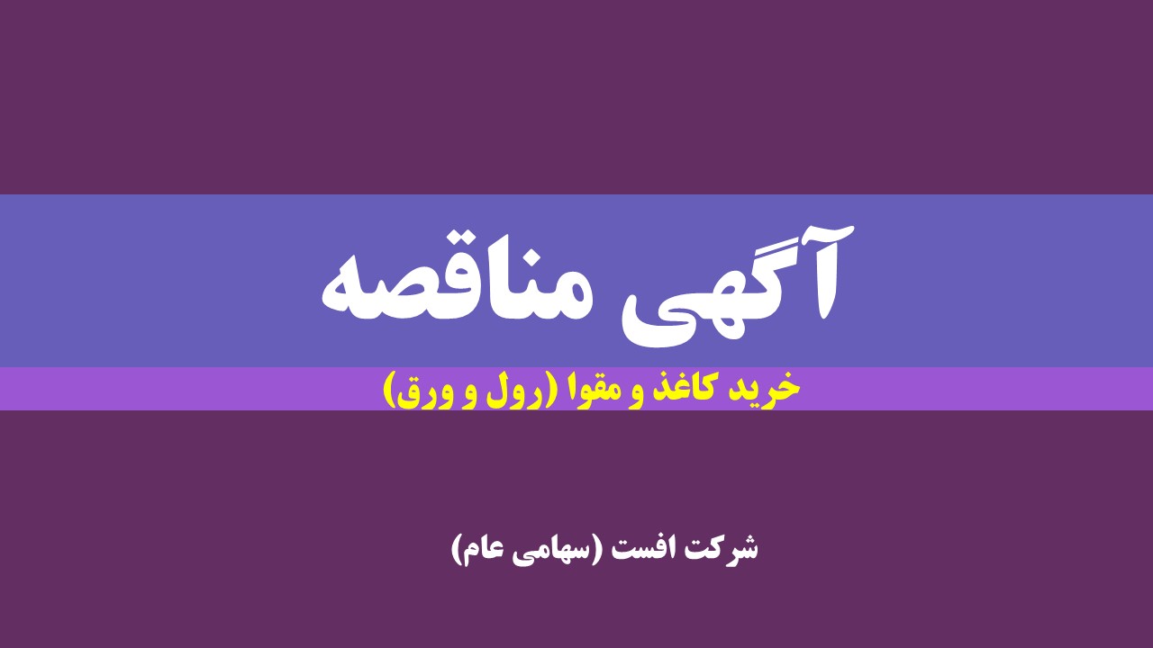 بدین وسیله شرکت افست (سهامی عام) و شرکت چاپ و نشر کتاب های درسی ایران تمایل خود را جهت خرید کاغذ و مقوا با مشخصات فوق الذکر به صورت کلی، یک یا چند گروه از طریق مناقصه عمومی از تولیدکنندگان داخلی اعلام می دارد.
