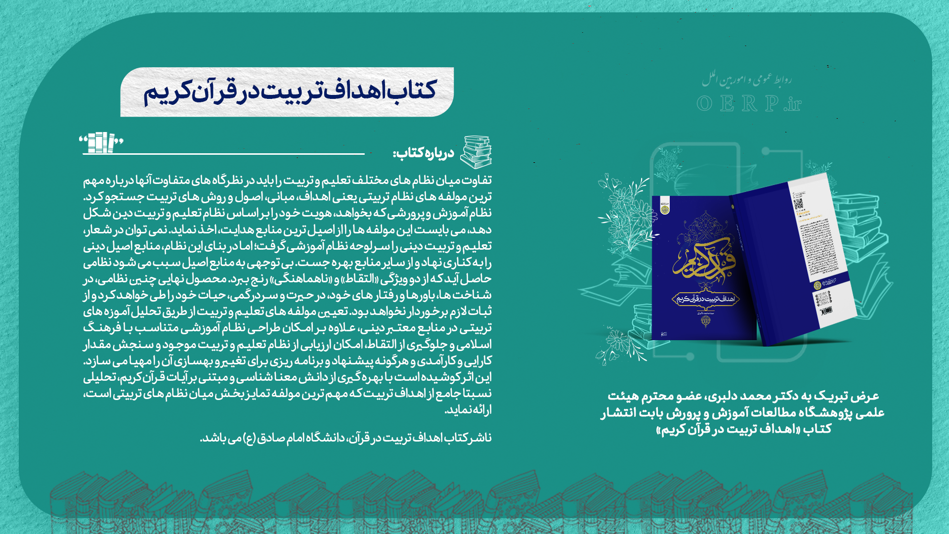 به گزارش اداره روابط عمومی و امور بین الملل سازمان پژوهش و برنامه ریزی آموزشی و به نقل از خبرگزاری ایکنا، کتاب اهداف تربیت در قرآن کریم نوشته سیدمحمد دلبری، عضو هیئت علمی پژوهشگاه مطالعات آموزش و پرورش روانه بازار نشر شد.این کتاب، دستنامهای برای طراحی نظام آموزشی متناسب با فرهنگ اسلامی، تدارک ارزیابی از نظام موجود تعلیم و تربیت و سنجش کارآیی و کارآمدی آن و تحلیلی جامع از اهداف تربیت بر مبنای معناشناسی و مبتنی بر قرآن کریم است. ناشر کتاب اهداف تربیت در قرآن، دانشگاه امام صادق (ع)، یکی از انتشارات دانشگاهی در ایران است.