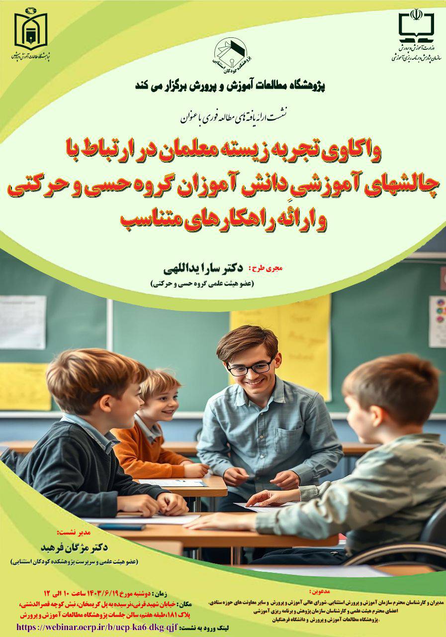 نشست با عنوان «واکاوی زیسته معلمان در ارتباط با چالش های آموزشی دانش آموزان گروه حسی و حرکتی و ارائه راهکارهای مناسب» آخرین بروزرسانی 18 شهریور 1403 به اشتراک بگذارید 34 0 نشست ارائه مطالعه فوری با عنوان «واکاوی زیسته معلمان در ارتباط با چالش های آموزشی دانش آموزان گروه حسی و حرکتی و ارائه راهکارهای مناسب» به همت پژوهشگاه مطالعات آموزش و پرورش در روز دوشنبه 19 شهریور ماه برگزار خواهد شد. نظر دهید آدرس ایمیل شما منتشر نخواهد شد. درج نظر الزامی می باشد نام نام الزامی می باشد ایمیل ایمیل الزامی می باشد آدرس ایمیل نامعتبر می باشد وب سایت