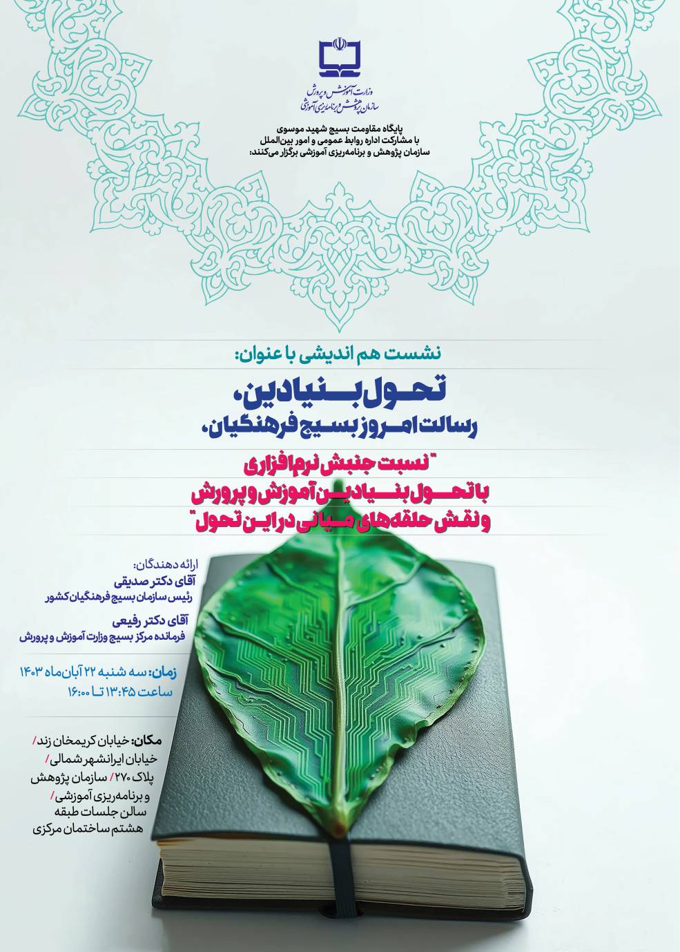 نشست هماندیشی با عنوان "تحول بنیادین رسالت امروز بسیج فرهنگیان نسبت جنبش نرمافزاری با تحول بنیادین آموزش و پرورش و نقش حلقههای میانی در این تحول" با حضور دکتر صدیقی رئیس سازمان بسیج فرهنگیان کشور و دکتر رفیع فرمانده مرکز بسیج در تاریخ سهشنبه 22 آبان 1403 از ساعت 13:45 الی 16 در محل سالن اجتماعات سازمان پژوهش و برنامهریزی آموزشی برگزار خواهد شد.