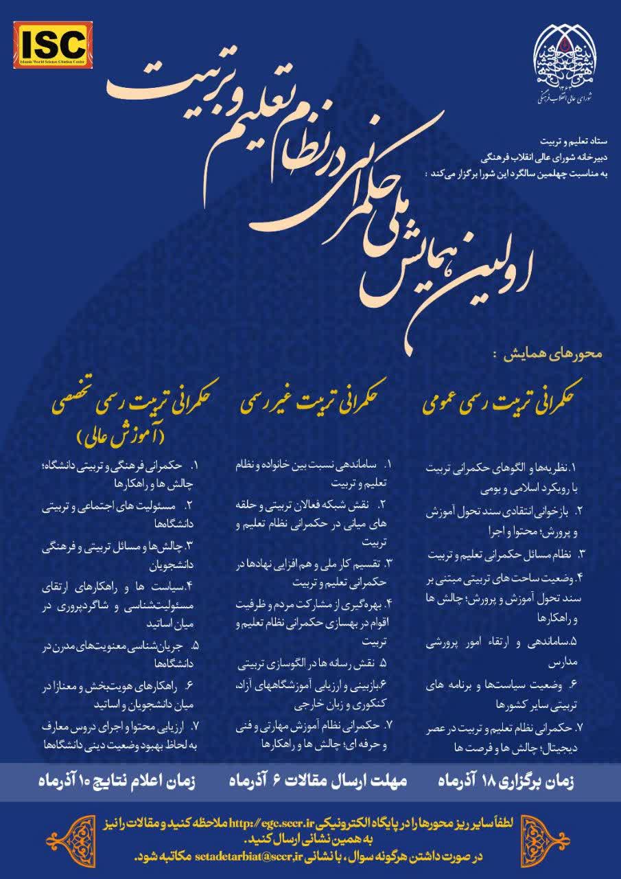 به گزارش روابط عمومی و امور بین الملل سازمان پژوهش و برنامه ریزی آموزشی، ستاد تعلیم و تربیت شورای عالی انقلاب فرهنگی در آستانه ورود به گام دوم این شورا، اولین همایش ملّی حکمرانی در نظام تعلیم و تربیت را برگزار می کند. این همایش در سه محور حکمرانی تربیت رسمی عمومی، حکمرانی تربیت غیررسمی و حکمرانی تربیت رسمی تخصصی (آموزش عالی) برگزار می گردد که هر محور شامل موضوعات زیر است: