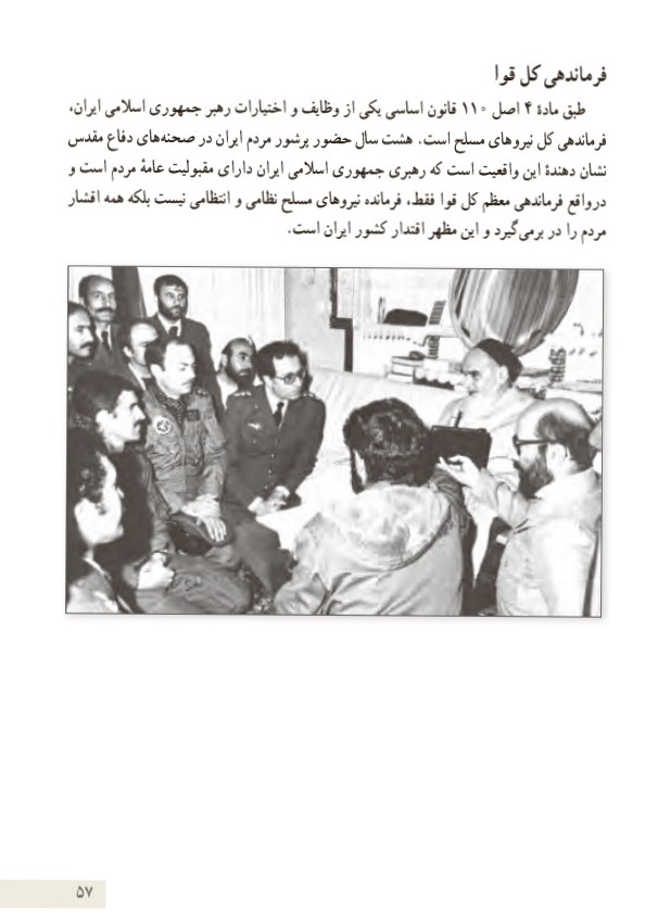 - آمادگی دفاعی پايه دهم، صفحه ۵۶، با عنوان فرماندهی کل قوا به اصل ۱۱۰ قانون اساسی مبنی بر اختیارات و وظایف رهبر جمهوری اسلامی ایران اشاره دارد.