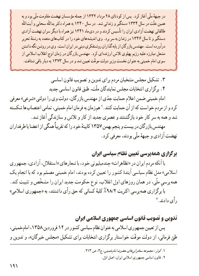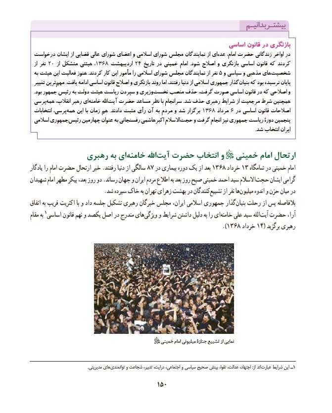 - تاریخ ایران و جهان معاصر پايه دوازدهم، صفحات ۱۴۲ و ۱۴۴، با عنوان استقرار نظام جمهوری اسلامی ایران به تدوین قانون اساسی در سال 1358 میپردازد و در صفحه ۱۵۰ در قالب بیشتر بدانیم به بازنگری در قانون اساسی در سال ۱۳۶۸ و انتخاب حضرت آیت الله خامنهای(مُدَّ ظِــلُّــهُ العالی) به رهبری مطابق اصل ۱۰۹ قانون اساسی اشاره دارد.