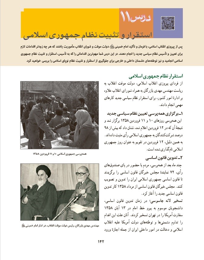 - تاریخ معاصر ایران پايه یازدهم، صفحات ۱۹۱ تا ۱۹۹ به تدوین و تصویب قانون اساسی جمهوری اسلامی ایران در سال ۱۳۵۸ میپردازد و در صفحه ۲۱۸ به اصل ۱۰۹ قانون اساسی مبنی بر انتخاب رهبری حضرت آیت الله خامنهای(مُدَّ ظِــلُّــهُ العالی) پس از ارتحال حضرت امام خمینی (ره) اشاره دارد. در صفحات ۲۲۴ تا ۲۲۶ ضمني آوردن مطالبي درباره قانون اساسی جمهوری اسلامی ایران، تدوین آن را یکی از دستاوردهای مهم ابعاد سیاسی انقلاب اسلامی بر ميشمارد.