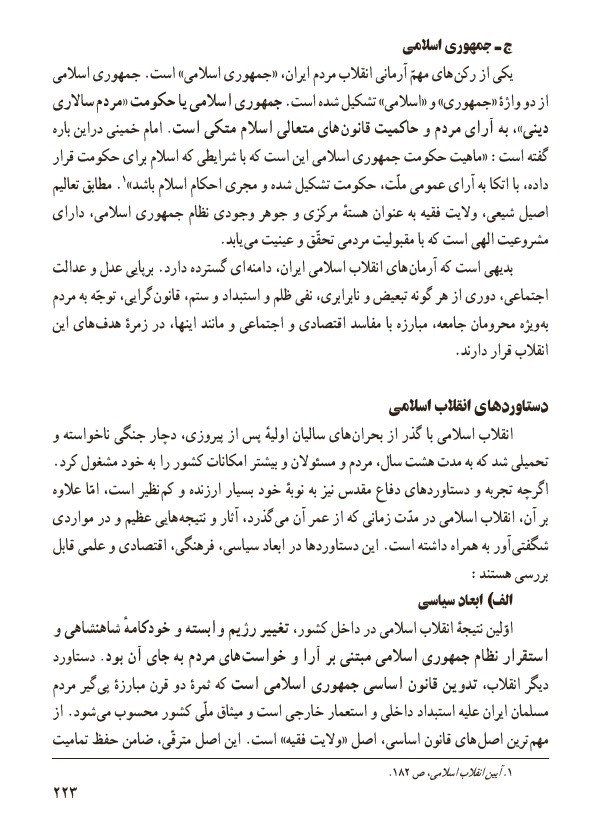 - تاریخ ایران در دوره اسلامی پايه دوازدهم، صفحات ۱۶۵ تا ۱۶۸ با عنوان تدوین قانون اساسی و صفحات ۱۷۳ تا ۱۷۵ با عنوان بازنگری در قانون اساسی و انتخاب حضرت آیت الله خامنهای(مُدَّ ظِــلُّــهُ العالی) به رهبری پس از ارتحال امام خمینی(ره) بر اساس اصل ۱۰۹ قانون اساسی.