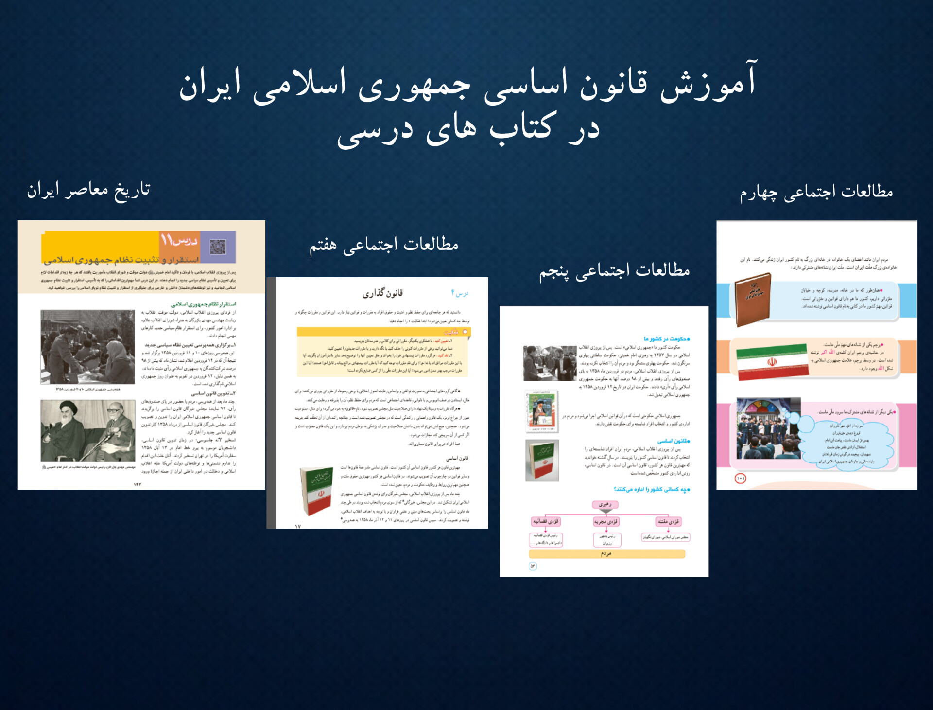 - مطالعات اجتماعی پايه نهم، صفحه ۱۰۷، با عنوان ایران در دوران پس از انقلاب اسلامی به تدوین و تصویب قانون اساسی جدید در مرداد ماه ۱۳۵۸ اشاره دارد. در صفحه ۱۱۲، به انتخاب حضرت آیت الله خامنهای(مُدَّ ظِــلُّــهُ العالی) به رهبری انقلاب اسلامی ایران پس از ارتحال حضرت امام خمینی(ره) بر اساس قانون اساسی جمهوری اسلامی ایران اشاره دارد و در صفحات ۱۳۹ تا ۱۵۳ نيز به اصول قانون اساسی کشور و ارکان حکومت و حقوق و تکالیف شهروندی در قانون اساسی جمهوری اسلامی ایران میپردازد.
