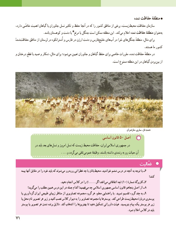 - انسان و محیط زیست پايه یازدهم، در بخش سخنی با دبیران گرامی به اصل ۵۰ قانون اساسی اشاره دارد.
