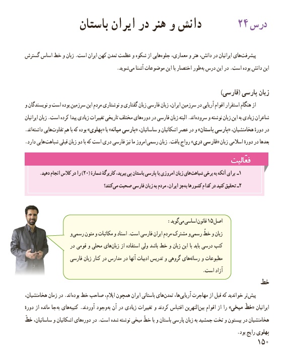 - فارسی 1 پايه دهم، در بخش پیشگفتار به اصل ۱۵ قانون اساسی و تحقق آن در کتابهای فارسی پايههاي مختلف تحصيلي اشاره دارد.
