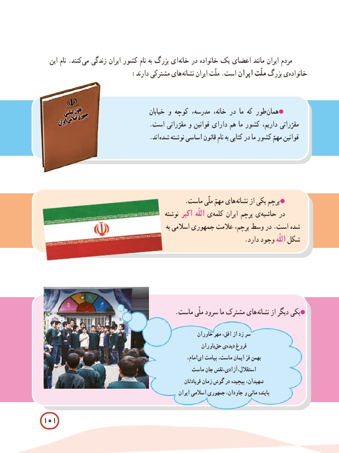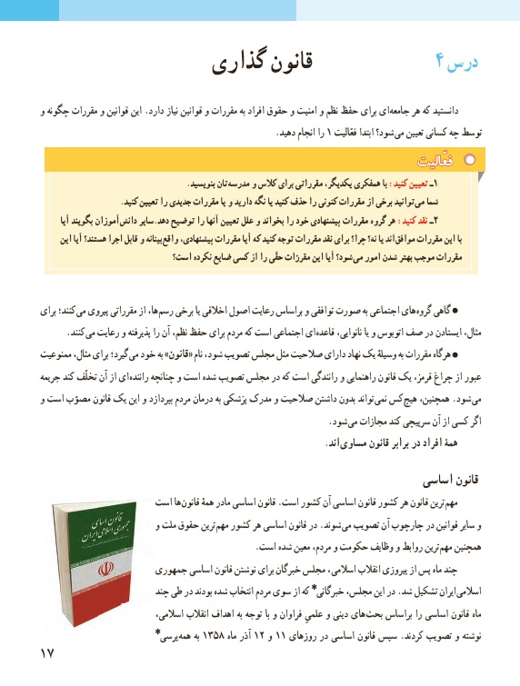 - مطالعات اجتماعی پايه چهارم، صفحه ۱۰۱ ، آوردن تصویری از کتاب قانون اساسی و بیان اهمیت قانون اساسی در کشور ایران