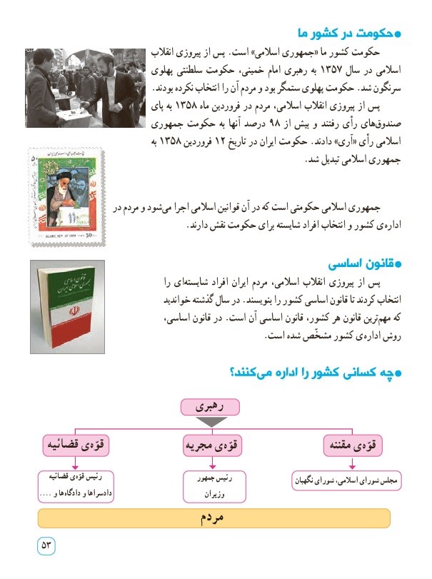 - مطالعات اجتماعی پايه پنجم، صفحات ۵۳ تا ۵۵ ، با عنوان قانون اساسی به تدوین این قانون پس از پیروزی انقلاب اسلامی و نحوه اداره کشور بر اساس قوای سه گانه اشاره دارد.