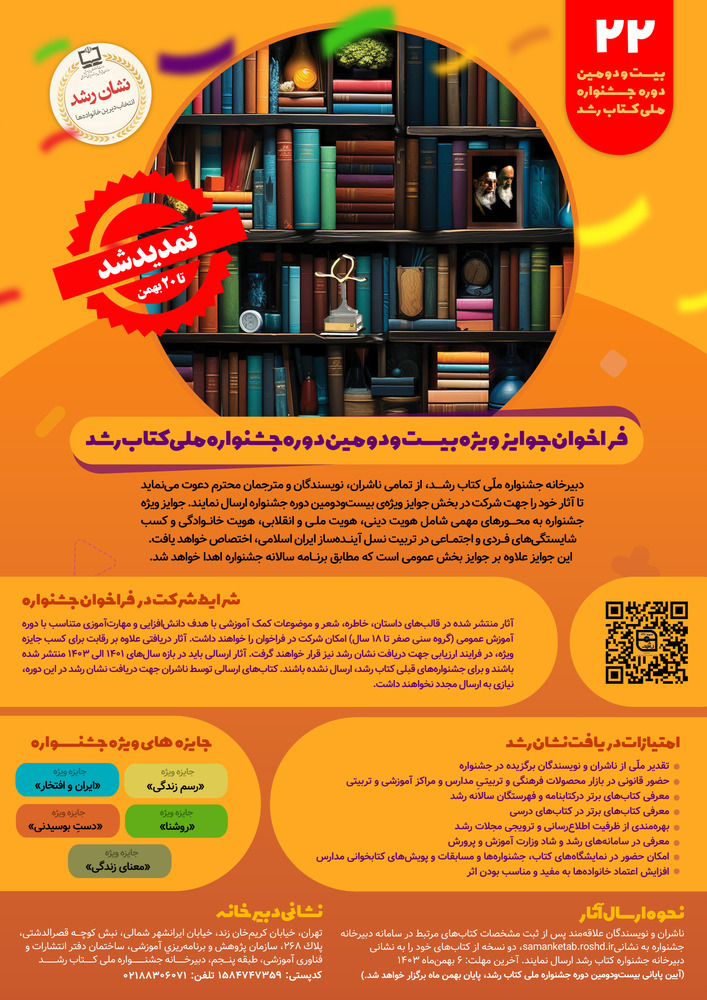 دبيرخانه جشنواره ملّی کتاب رشد، از تمدید مهلت ارسال آثار در بخش جوایز ویژه بیستودومین دوره جشنواره ملی کتاب رشد خبر داد.