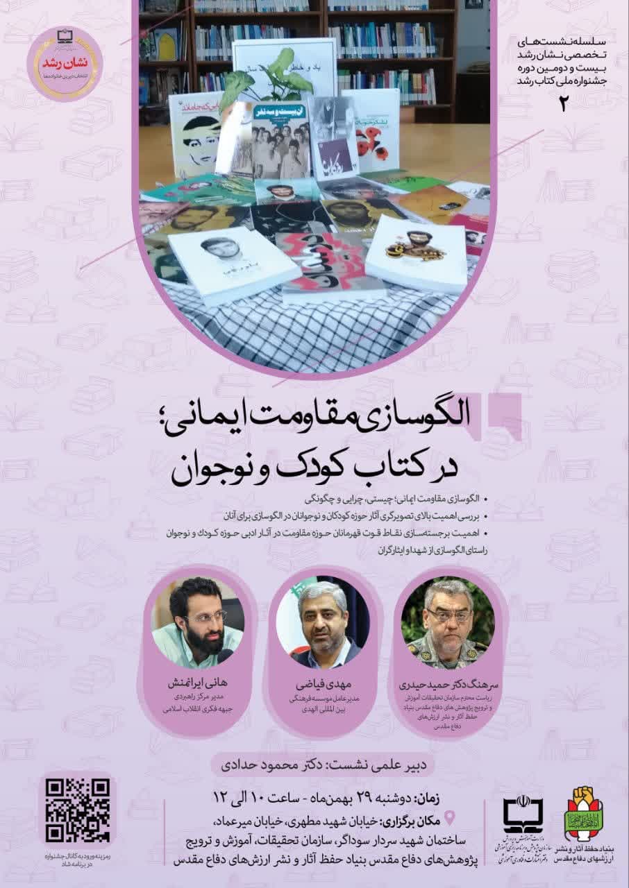 دومین نشست از سلسله نشستهای بیستودومین جشنواره ملی کتاب رشد با عنوان « الگوسازی مقاومت ایمانی در کتاب کودک و نوجوان» برگزار میشود.