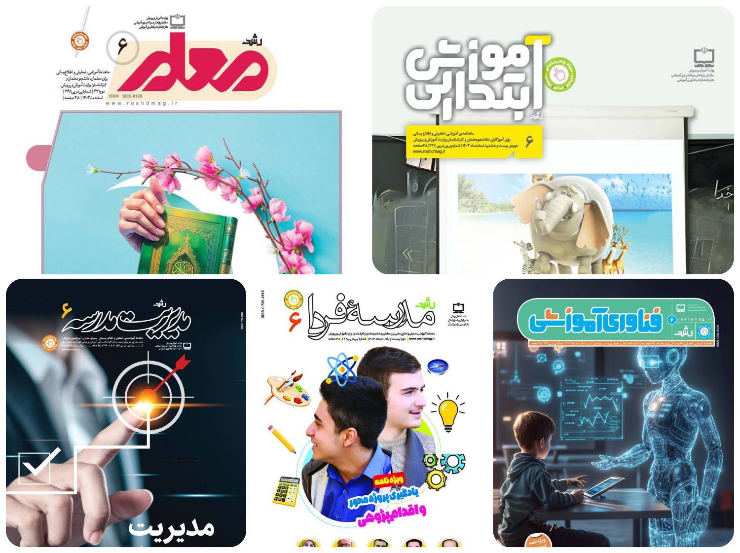 به گزارش اداره روابط عمومی و امور بین الملل، ششمین شماره از مجلههای آموزشی و تربیتی «رشد معلم»، «رشد مدیریت مدرسه»، «رشد آموزش ابتدایی»، «رشد فناوری آموزشی» و «رشد مدرسه فردا» از گروه ماهنامههای عمومی بزرگسال منتشر شدند. سازمان پژوهش و برنامهریزی آموزشی این مجلات را به عنوان جزئی از بستههای تربیت و یادگیری، در چارچوب اهداف نظام آموزشوپرورش جمهوری اسلامی ایران تولید و منتشر میکند. بخشهایی از هر مجله را با هم ببینیم: