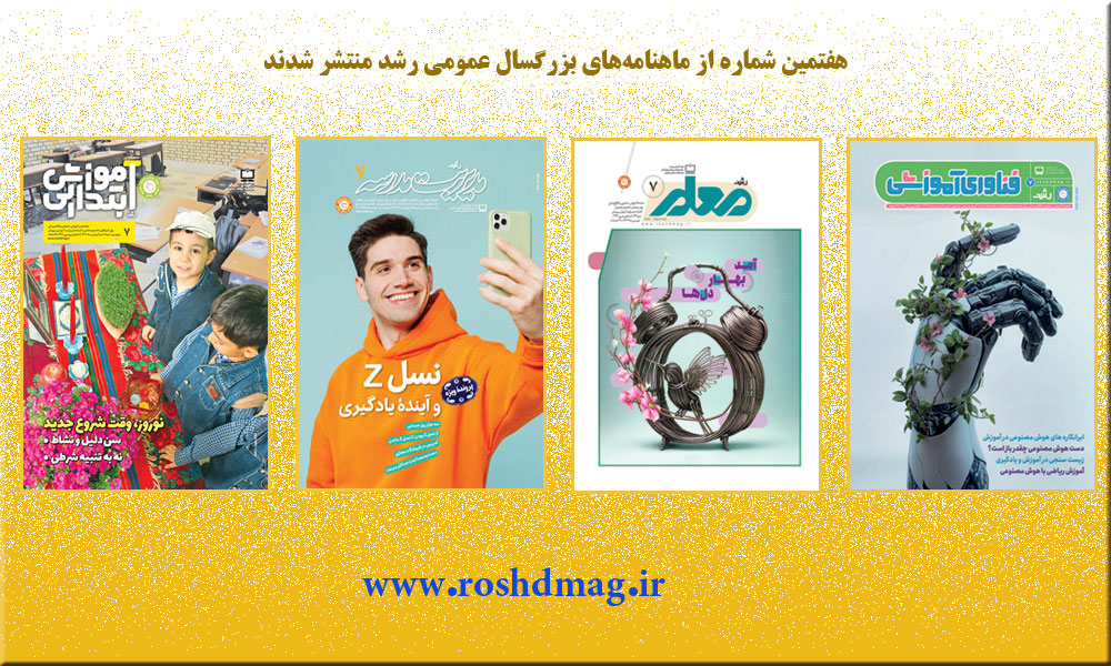 به گزارش اداره روابط عمومی و امور بين‌الملل سازمان پژوه و برنامه‌ريزی آموزشی و به نقل از واحد خبر و رسانه دفتر انتشارات و فناوری آموزشی، هفتمین شماره از مجله‌‌های آموزشی و تربیتی رشد معلم، رشد مدیریت مدرسه، رشد آموزش ابتدایی و رشد فناوری آموزشی از گروه ماهنامه‌های عمومی بزرگسال منتشر شدند. این مجلات با تمرکز بر موضوعاتی مانند «تربیت نسل زد»، «تشویق مؤثر»، «مهارت‌های معلمی» و «نوآوری‌های فناوری آموزشی»، پاسخی به دغدغه‌های روز نظام تعلیم و تربیت ارائه کرده‌اند. بخش‌هایی از هر مجله را با هم ببینیم: