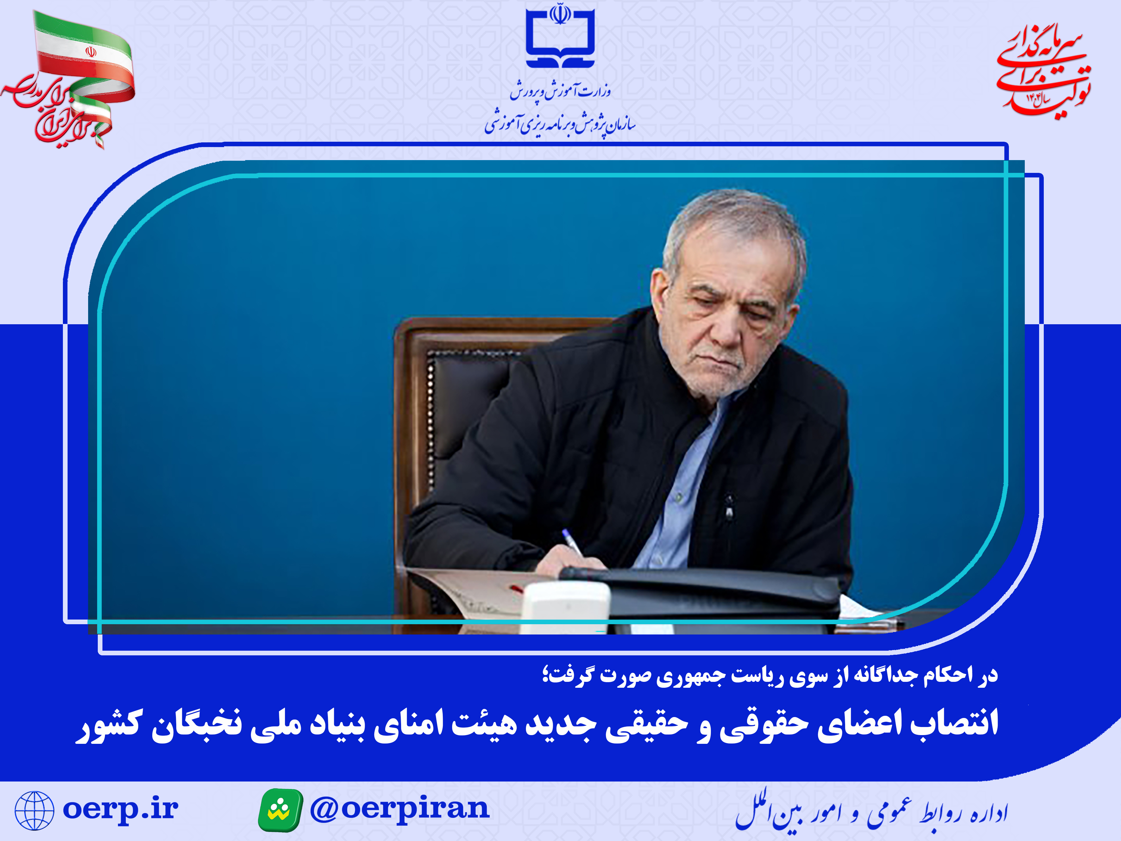 به گزارش اداره روابط عمومی و امور بينالملل سازمان پژوهش و برنامهريزی آموزشی، رئيس جمهور مسعود پزشکیان در حکمی، به استناد تبصره (2) بند (الف) ماده (8) اساسنامه اصلاحی بنیاد ملی نخبگان کشور مصوب 23 آبان 1385 شورایعالی انقلاب فرهنگی آقایان محمدرضا عارف معاون اول رئیس جمهور، علیرضا کاظمی وزیر آموزش و پرورش، محمدرضا ظفرقندی وزیر بهداشت، حسین سیمایی صراف وزیر علوم، سید عباس صالحی وزیر فرهنگ، علاءالدین رفیعزاده رئیس سازمان اداری و استخدامی، سید حمید پورمحمدی رئیس سازمان برنامه و بودجه، حسین افشین معاون علمی رئیس جمهور و رئیس بنیاد ملی نخبگان، عبدالحسین خسروپناه دبیر شورایعالی انقلاب فرهنگی، محمدمهدی طهرانچی رئیس دانشگاه آزاد اسلامی، علی منتظری رئیس جهاد دانشگاهی، علیرضا منادی سفیدان رئیس کمیسیون آموزش مجلس و مصطفی رستمی رئیس نهاد نمایندگی مقام معظم رهبری در دانشگاهها را به عنوان اعضای حقوقی هیئت امنای بنیاد ملی نخبگان کشور منصوب کرد.