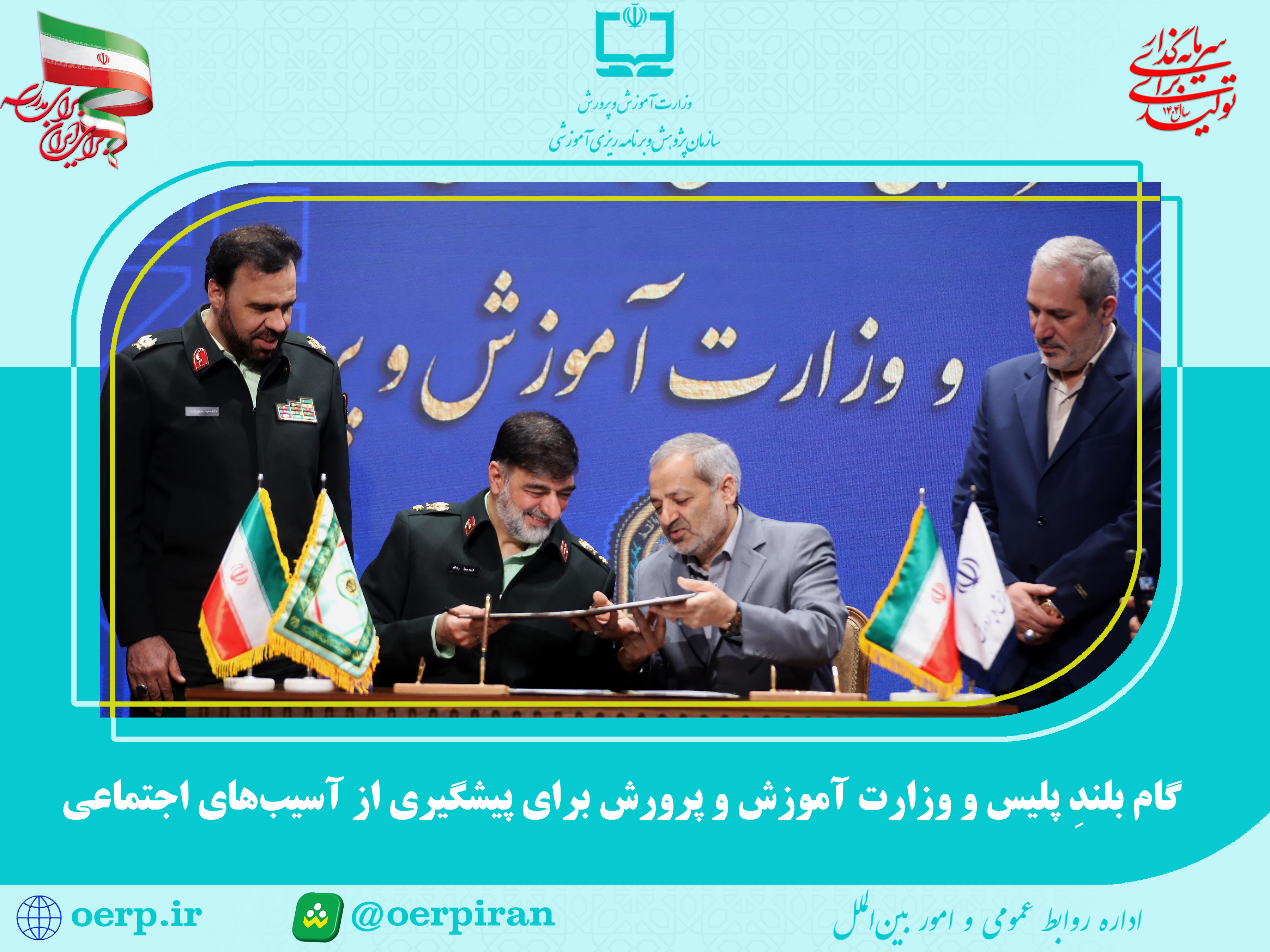 تفاهمنامه همکاری مشترک فرماندهی انتظامی جمهوری اسلامی ایران و وزارت آموزش و پرورش با هدف توسعه همکاریهای آموزشی، اجتماعی و فرهنگی، پیشگیری از آسیبهای اجتماعی، افزایش آگاهیهای عمومی در آیینی توسط علیرضا کاظمی و سردار احمدرضا رادان امضا شد.