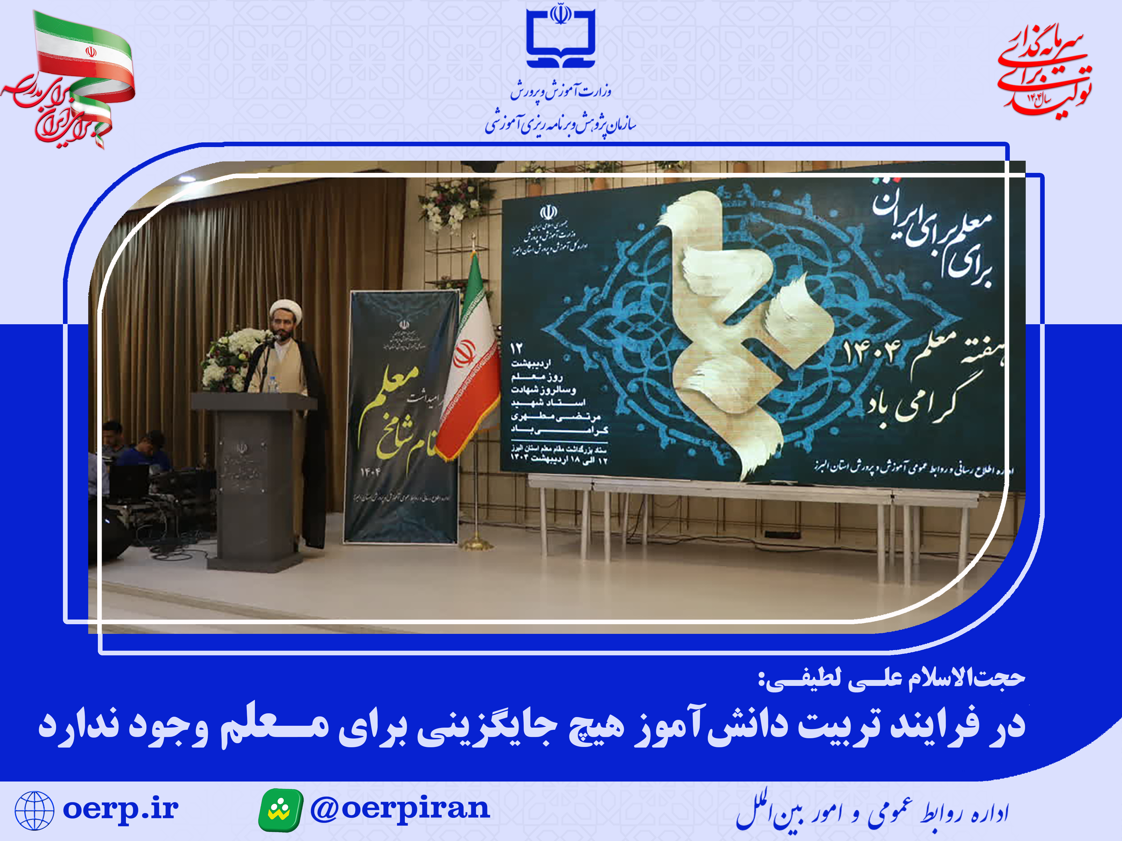 به گزارش روابط عمومي سازمان پژوهش و برنامهريزی آموزشي، در این نشست که با حضور مسئولین استان البرز برگزار شد حجتالاسلام علی لطیفی ضمن گراميداشت هفته بزرگداشت مقام معلم و قرائت پیام مقام عالی وزارت، گفت: توفيق حضور در جمع معلمان و فرهیختگان نظام تعلیم و تربیت فرصت مغتنمی است و همواره اين همراهی، احساس شوق و مسرت ويژهای را برای من ایجاد میکند.