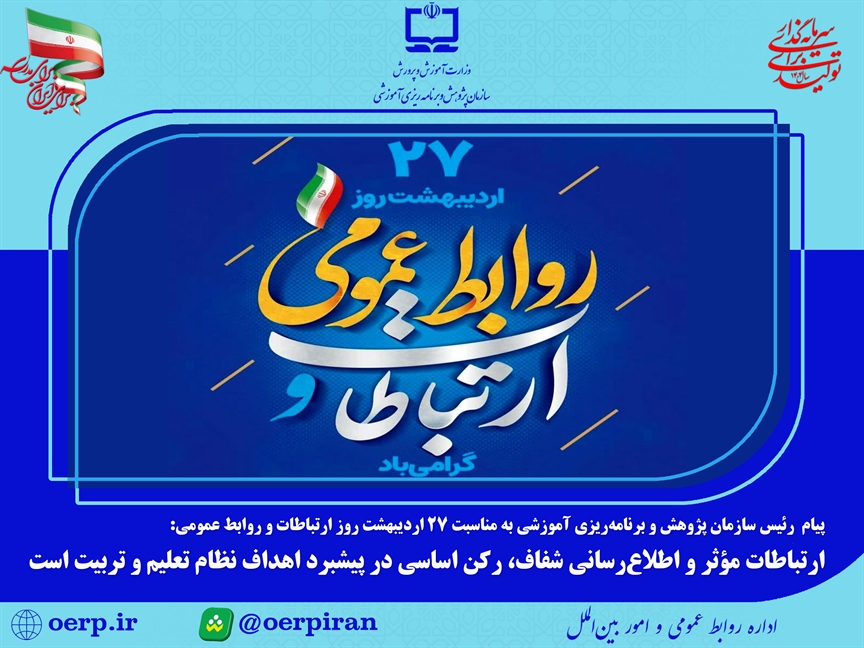 همزمان با 27 ارديبهشت و روز ارتباطات و روابط عمومی ، معاون وزير و رئيس سازمان پژوهش و برنامهریزی آموزشی پيامی صادر كرد.