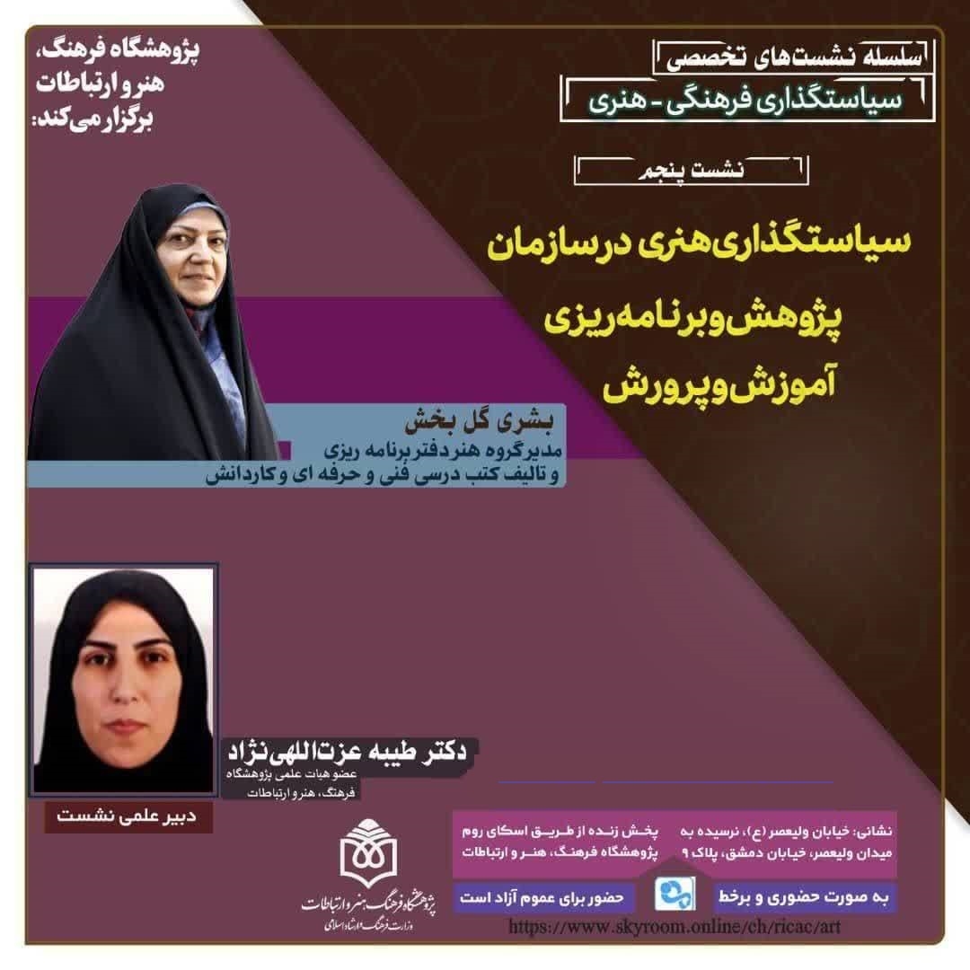 پنجمین نشست از سلسه جلسات سیاستگذاری فرهنگی- هنری با عنوان «بررسی سیاستگذاری هنری در سازمان پژوهش و برنامهریزی آموزش و پرورش» با حضور خانم بشری گلبخش، رئيس گروه هنر دفتر برنامهریزی و تالیف کتب درسی فنی و حرفهای و کاردانش و دکتر طیبه عزتاللهینژاد، عضو هیات علمی و مدیر پژوهشکده هنر روز در سالن جلسات پژوهشگاه فرهنگ، هنر و ارتباطات برگزار گردید.
