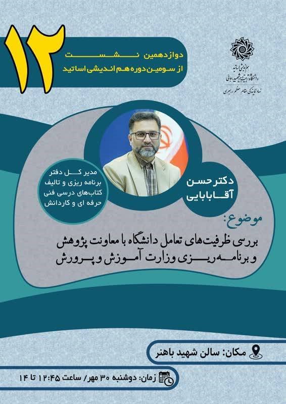 روز دوشنبه سی ام مهر ماه دوازدهمین نشست از سومین دوره هم اندیشی استادان با موضوع "بررسی ظرفیت‌های تعامل دانشگاه با سازمان پژوهش‌‌ و برنامه‌ریزی آموزشی وزارت آموزش و پرورش، دفتر برنامه ریزی و تالیف کتاب‌های درسي فنی وحرفه ای و کاردانش" با حضور آقای دکتر حسن آقابابایی مدیر کل دفتر برنامه ریزی و تألیف کتابهای درسی فنی حرفه ای و کاردانش از ساعت ۱۲.۴۵ تا ۱۴.۰۰ در سالن شهید باهنر دانشگاه تربیت دبیر شهید رجایی برگزار شد.